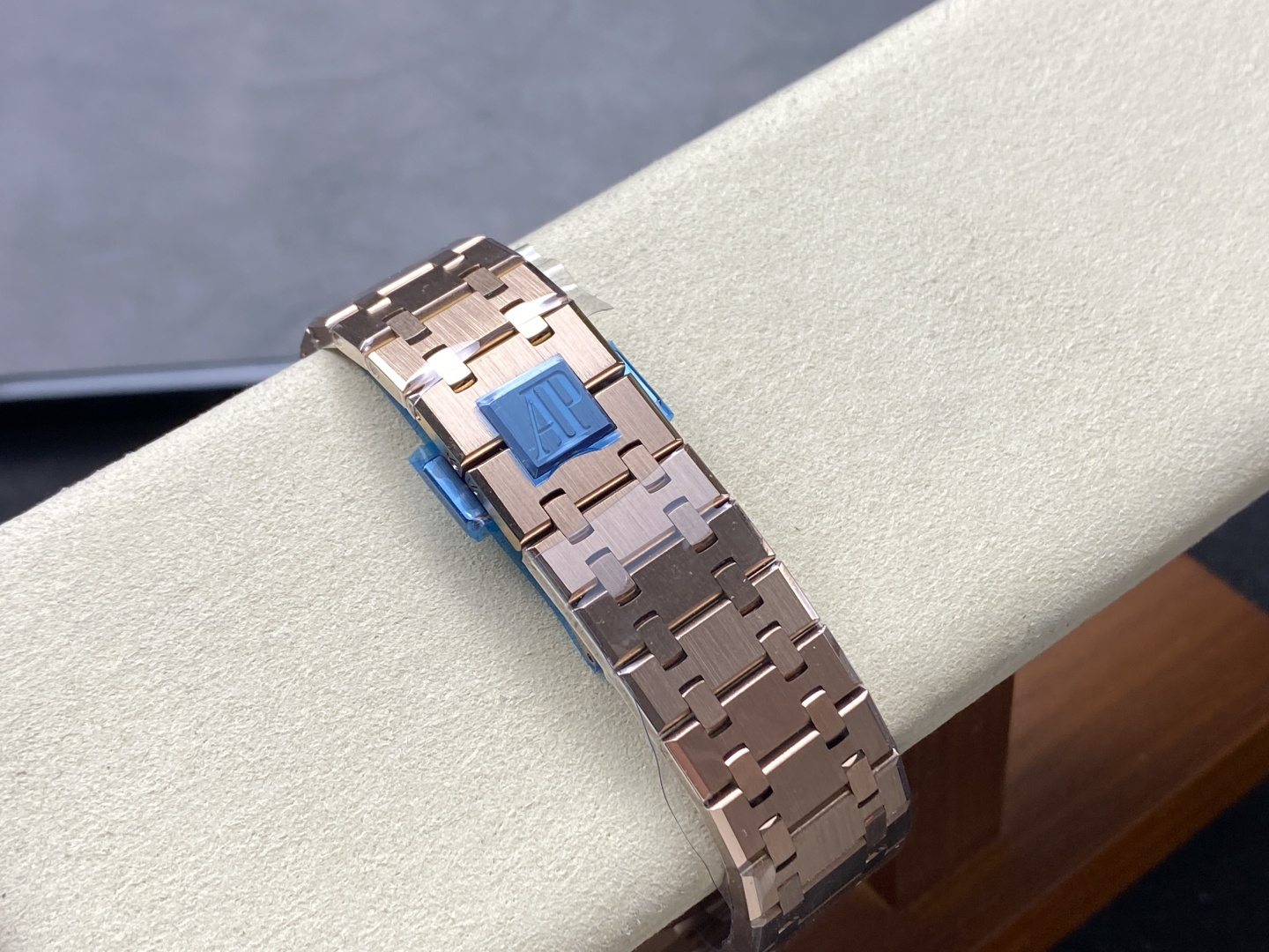 Robust 41 mm rose gold–tone case, finished with the classic Royal Oak octagonal bezel and exposed screws. Protected by sapphire crystal on the front and back, delivering both durability and a premium visual presence.