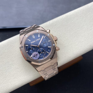 Features a deep “Bleu Nuit, Nuage 50” dial with the signature Grande Tapisserie pattern. The chronograph sub-dials are perfectly balanced, complemented by rose gold–tone applied hour markers and Royal Oak hands with luminescent coating for optimal readability.