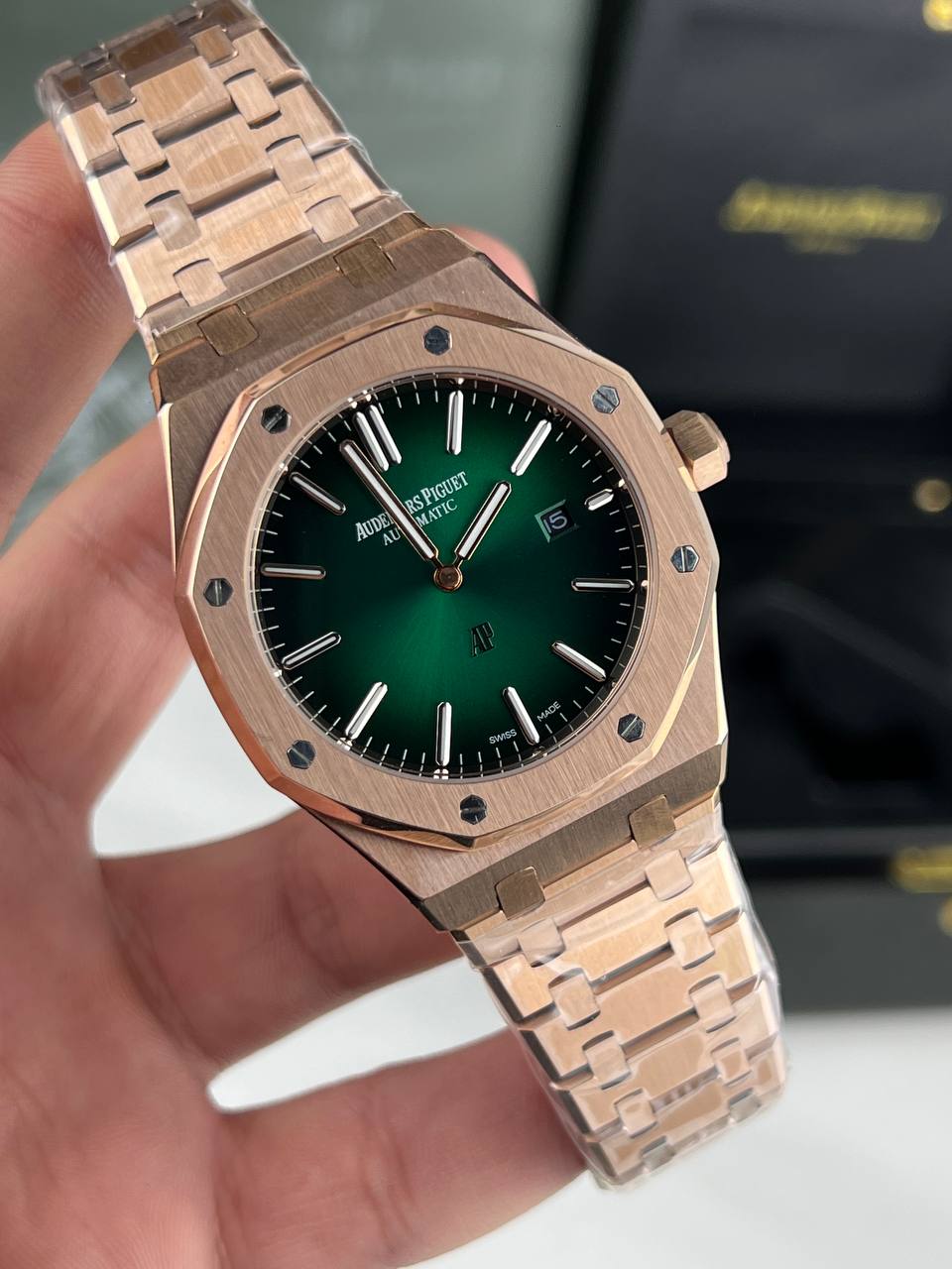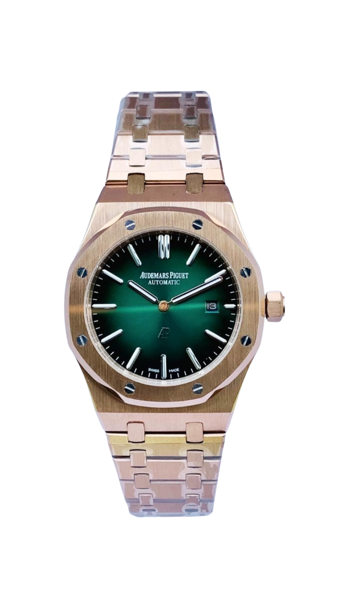 Dial Color: Khaki green with a “Grande Tapisserie” pattern, featuring pink gold tone applied hour markers and Royal Oak hands with a luminescent coating